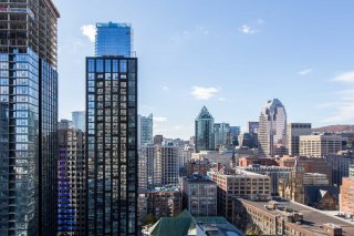 Luxuriate in a 1-bed condo on Maestria's 32nd floor in Quartier des Spectacles, Montreal. Enjoy panoramic views near Place des Arts. Amenities: golf simulator, cinema, gym, pools, Sky-bridge. Embrace city life with fine dining, shopping, schools, and metro nearby.